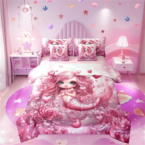 Dreamy Mermaid Comforter Set 7 Pieces,Pink Mermaid Princess Bed Set For Girls,Romantic Love Roses Bedding Bed In A Bag,Queen (1 Comforter,2 Pillowcase
