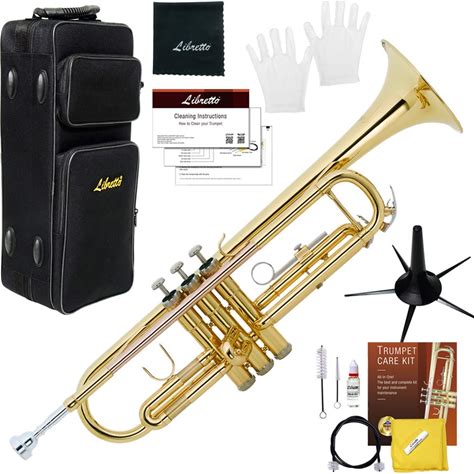 Libretto Gold Lacquer Bb Trumpet Set, Rose Brass Leadpipe, Standard For Beginner & Intermediate Students, Stainless Valve, 7C Mouthpiece, Durable Case