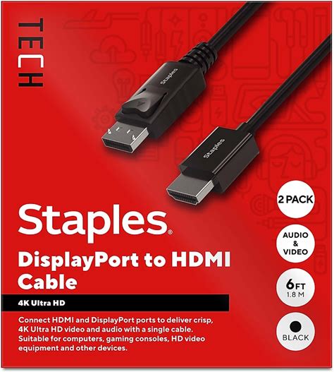 Staples TECH 6 ft. Display Port To HDMI Audio/Video Cable, Male To Male, Black, 2/Pack (ST62466-VB)