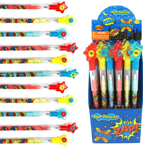 TINYMILLS 24 Pcs Superhero Text Multi Point Stackable Pencil With Eraser For Superhero Birthday Party Favor Prize Carnival Goodie Bag Stuffers