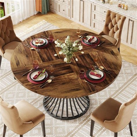 Halseey Rustic Brown Wood 47 in. Round Pedestal Dining Table With Metal Base Seats 4-6 People For Kitchen, Living Room