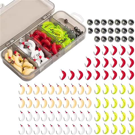 LUSHAZER 80-200Pcs Maggot Grub Fishing Lure Kit Soft Wax Worm Hook Rig Split Shot Weight Ice Panfish Trout Bait Tackle Box Set